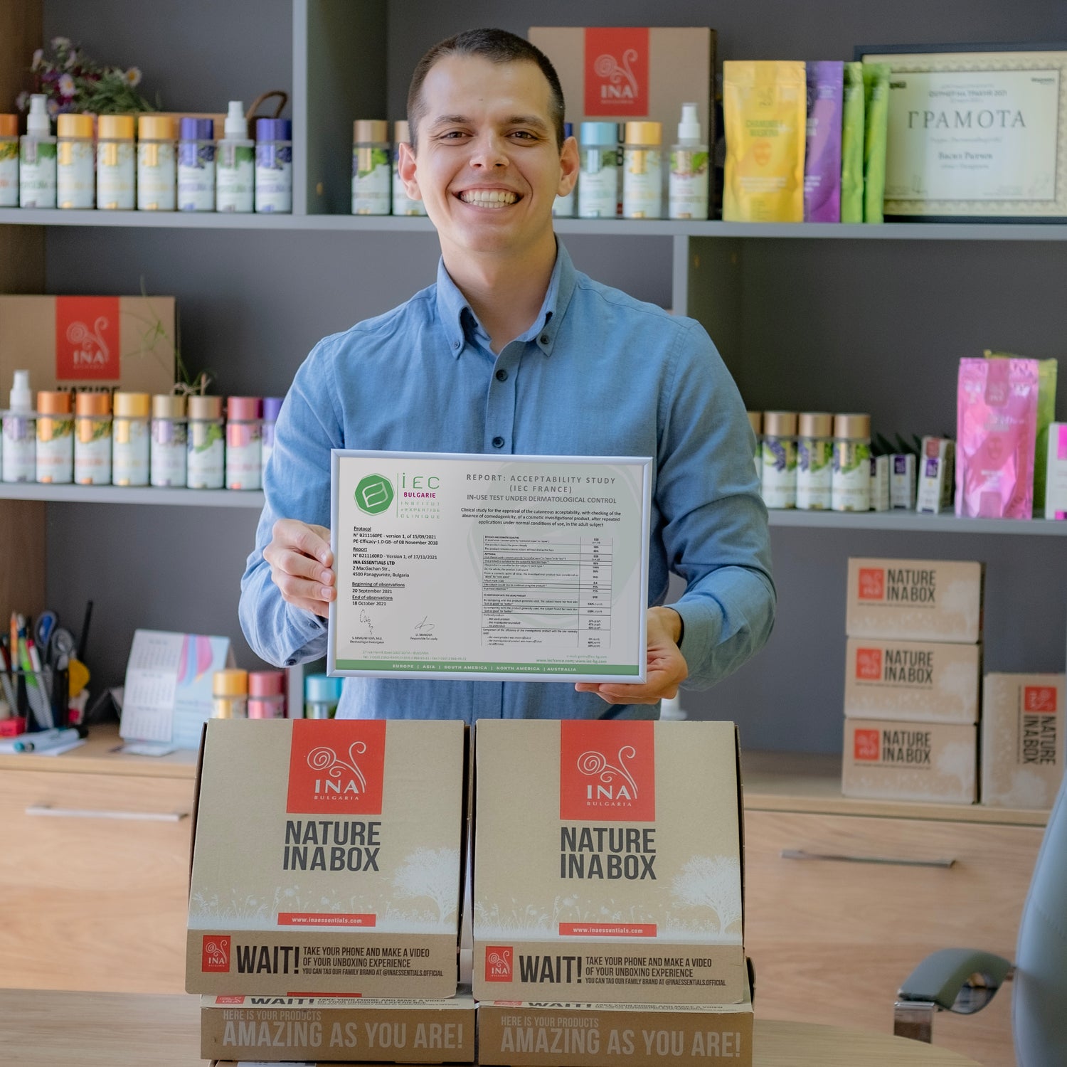 Bucurați-vă de o experiență completă cu produsele InaEssentials. Produsele noastre naturale InaEssentials ajung într-o cutie Nature INA - o cutie de carton reciclată cu design personalizat care transmite istoria și valorile familiei noastre - grija pentru natură și grija pentru tine, clienții noștri.