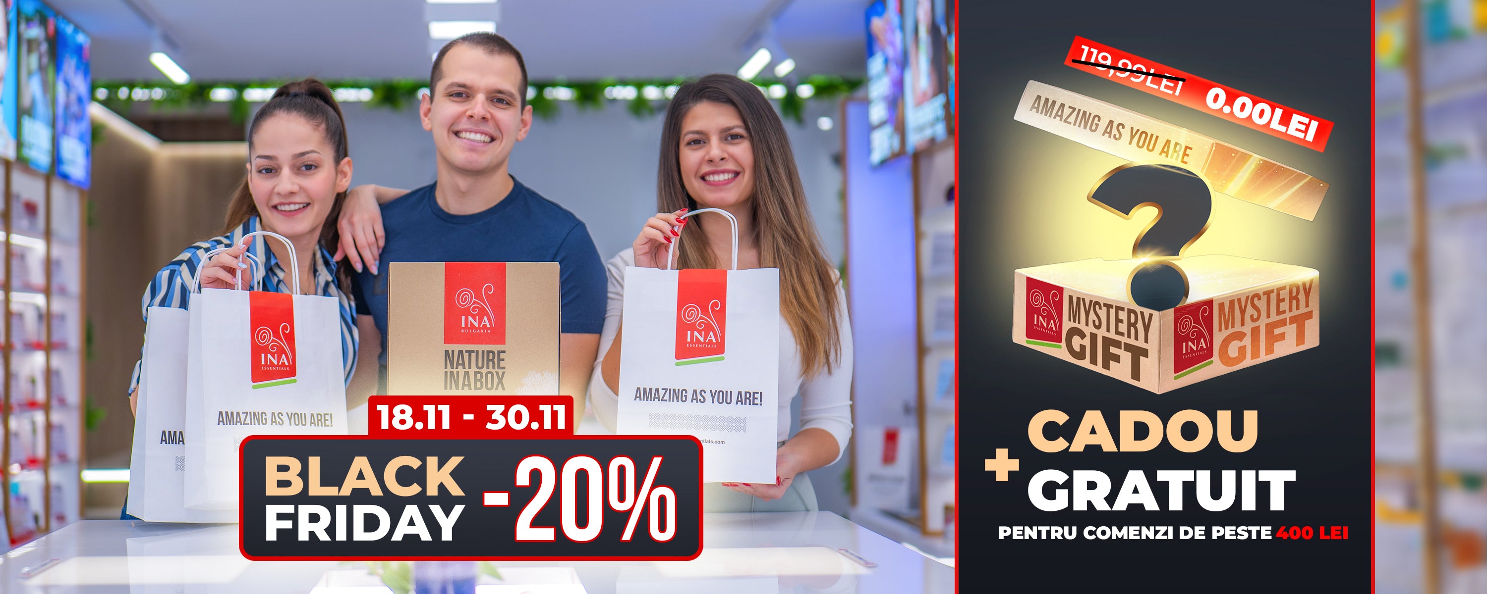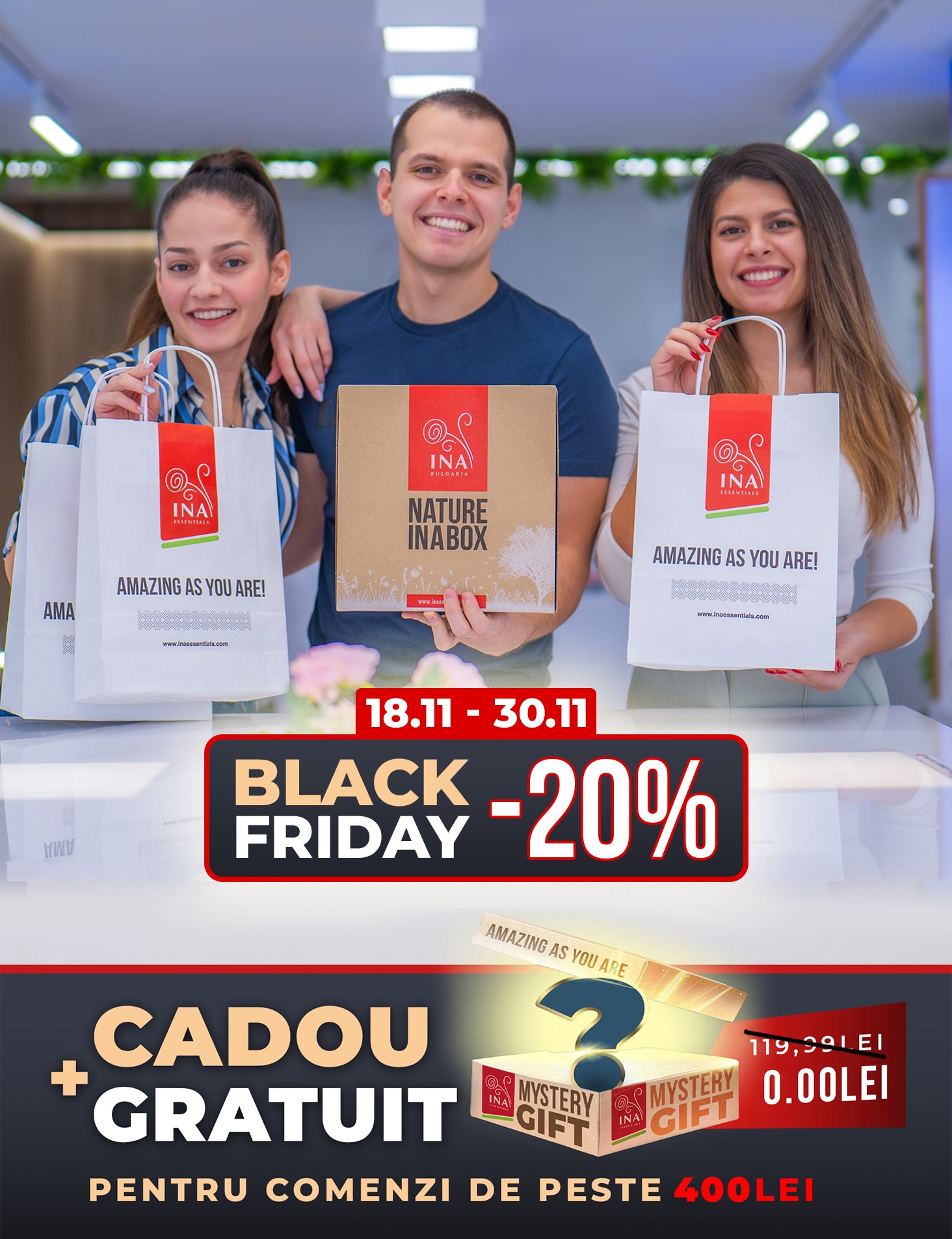 Bucurați-vă de o experiență completă cu produsele InaEssentials. Produsele noastre naturale InaEssentials ajung într-o cutie Nature INA - o cutie de carton reciclată cu design personalizat care transmite istoria și valorile familiei noastre - grija pentru natură și grija pentru tine, clienții noștri.