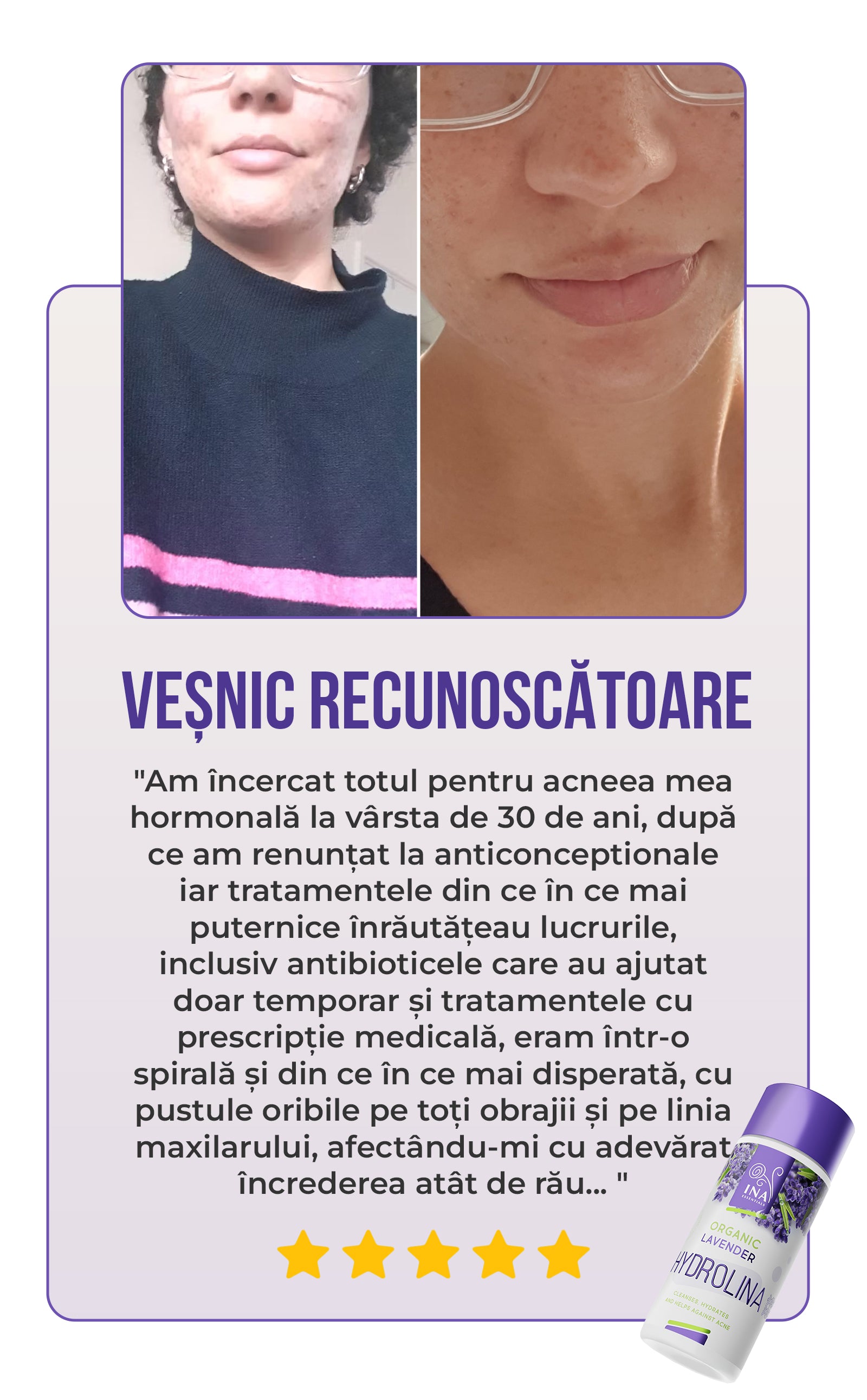 Am cumpărat setul cu Hydrolina de lavanda pentru fiica mea. Îl folosește de două săptămâni și deja se vede o îmbunătățire a acneei, ceea ce o ajută și la încrederea de sine.