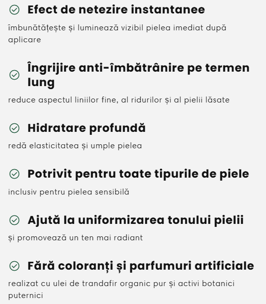 "La 45 de ani și după 2 nașteri, pielea mea și-a pierdut strălucirea. Acest ser l-a adus înapoi în doar câteva săptămâni. Soțul meu chiar a observat și m-a întrebat ce am folosit."