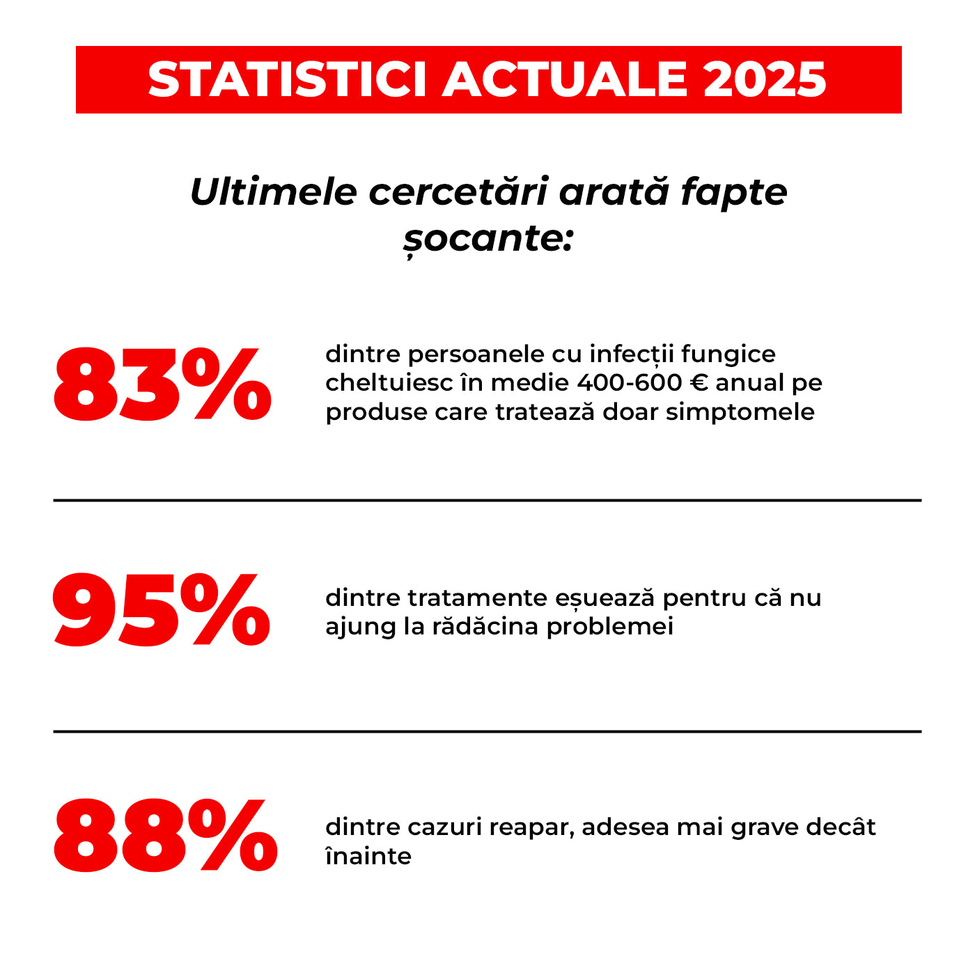 83% dintre persoanele care se confruntă cu ciupercă cheltuiesc în medie 1000-1300 lei pe an pe produse care tratează doar simptomele, iar 95% dintre tratamente eșuează pentru că nu ajung la rădăcina probleme, 88% din cazuri revin din nou, adesea mai severe decât înainte.
