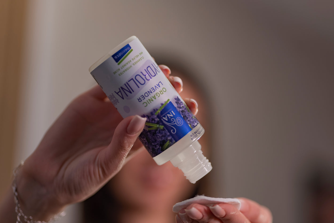 Pentru rezultate optime, aplică Hydrolina de Lavandă folosind o dischetă de bumbac de 1-2 ori pe parcursul zilei.